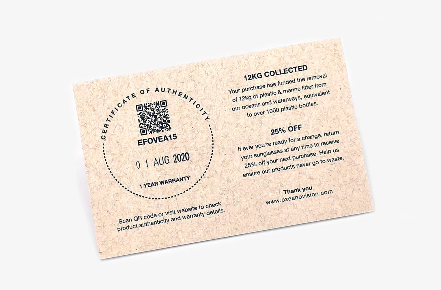 All Ozeano eyewear comes complete with a certificate of authenticity, containing the unique product ID of your frames, and a date stamp of the certification.