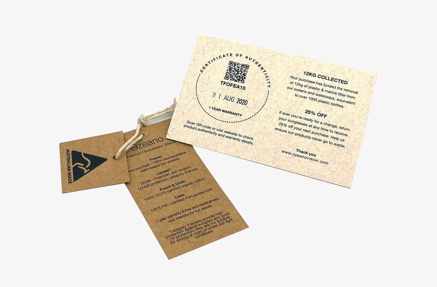 Our product hang tags and certificates are made from FSC-certified natural Kraft paper and printed with waterless vegetable-based ink. Kraft paper is made from unbleached natural kraft fibres, can be entirely recycled multiple times, and is 100% biodegradable. To ensure we're giving back to nature, our Australian family-run supplier plants a tree for every order we place with them.